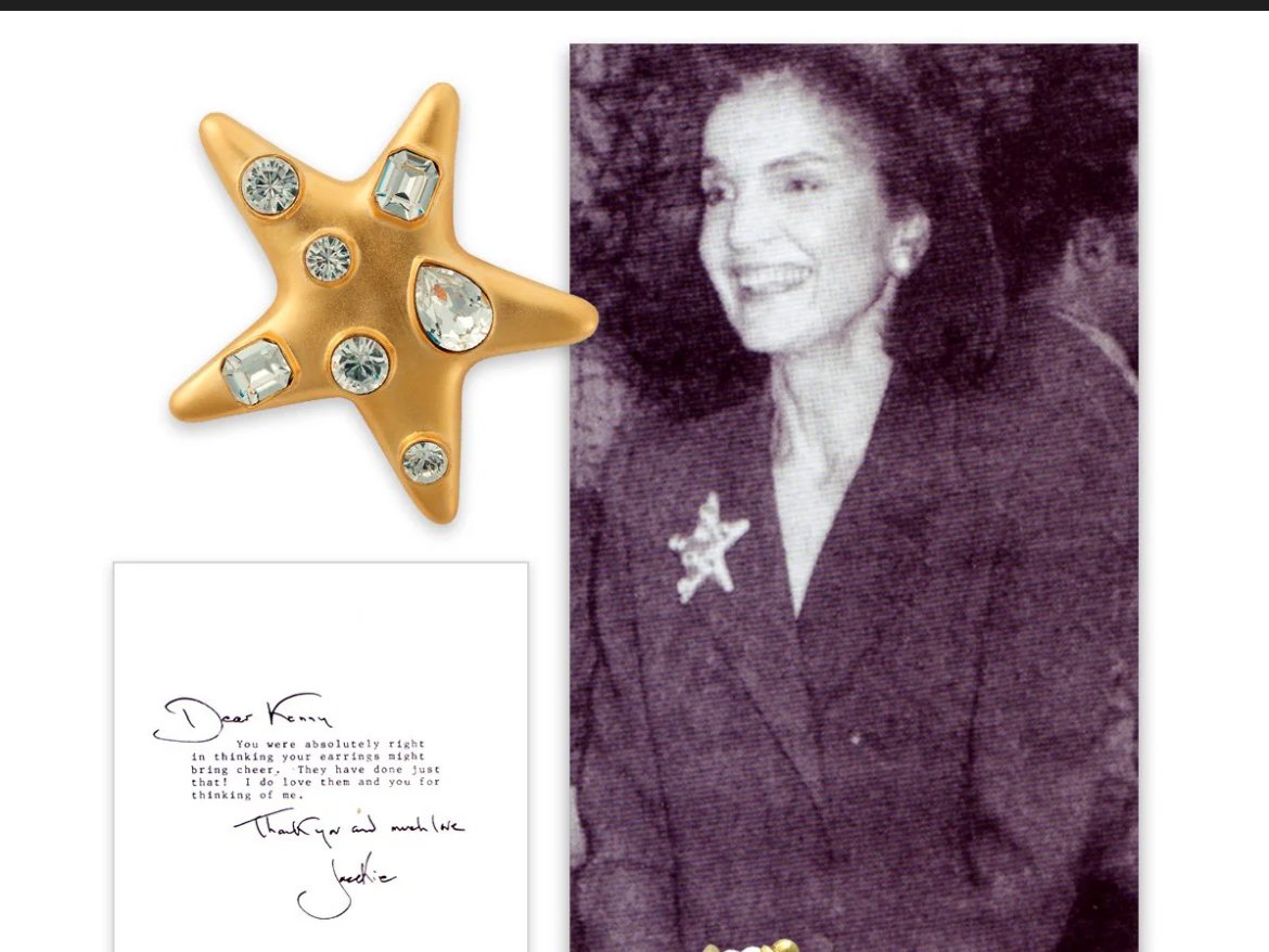 This collectible vintage brooch was designed by Kenneth Jay Lane for Jackie Onassis, who famously wore it to a book party in Manhattan in 1991. Crafted out of a brushed satin, gold-plated diamanté star encrusted with large crystal rhinestones. The back features the pin’s hardware, and an additional metal loop allowing it to double as a pendant for a necklace or a choker. Also on the back is the maker’s mark, “KJL”. The original brooch owned by “Jackie O” sold at auction for almost $20k! These are now a permanent part of KJL’s line, but the vintage collection from the ‘90s are few and far between, and harder to find, making this a highly sought-after and desirable work of wearable art history. More than anything, it is a stunning piece of jewelry with a timeless design that evokes the decadence of the art deco era, the whimsy of the atomic era, and the pizzazz of the 1990s!