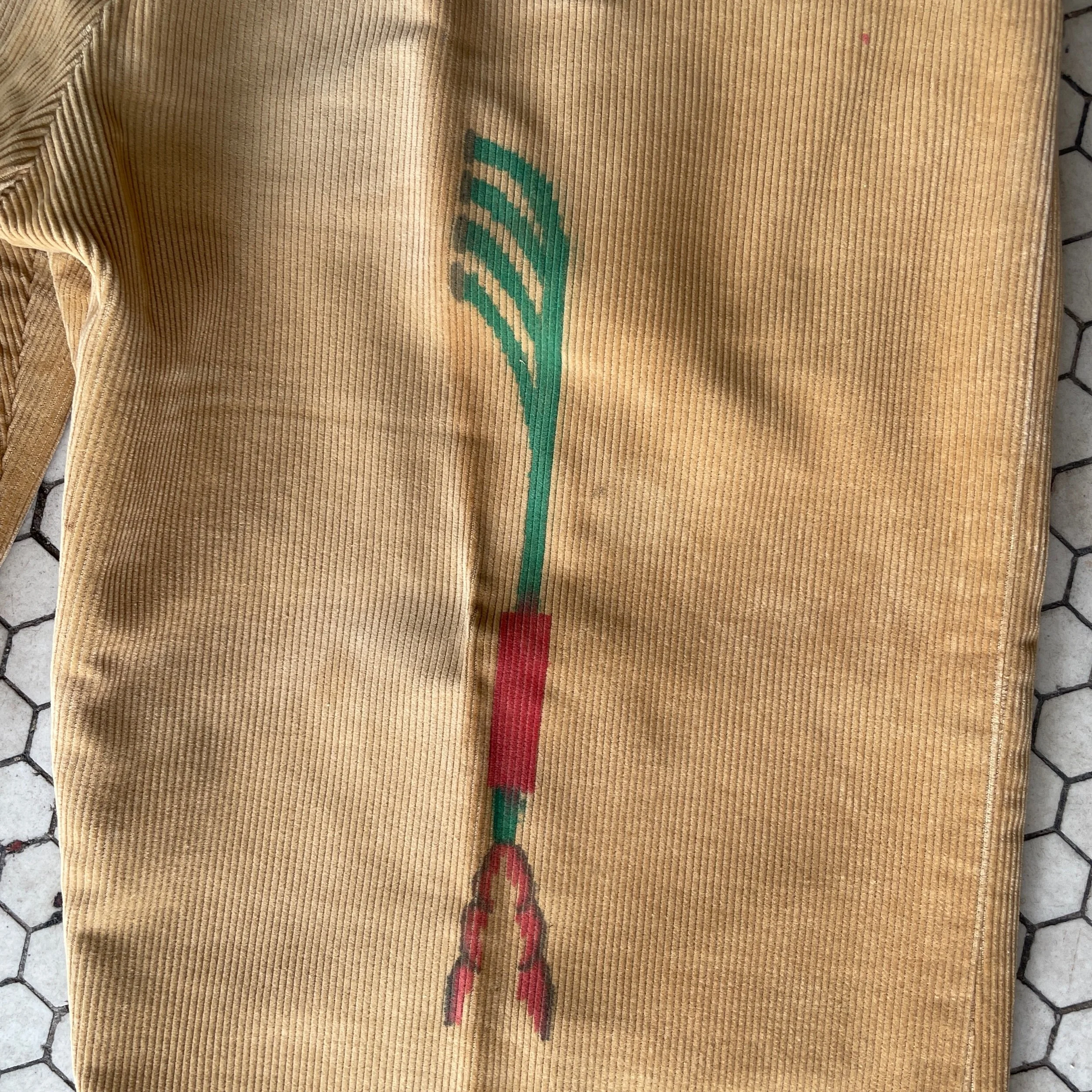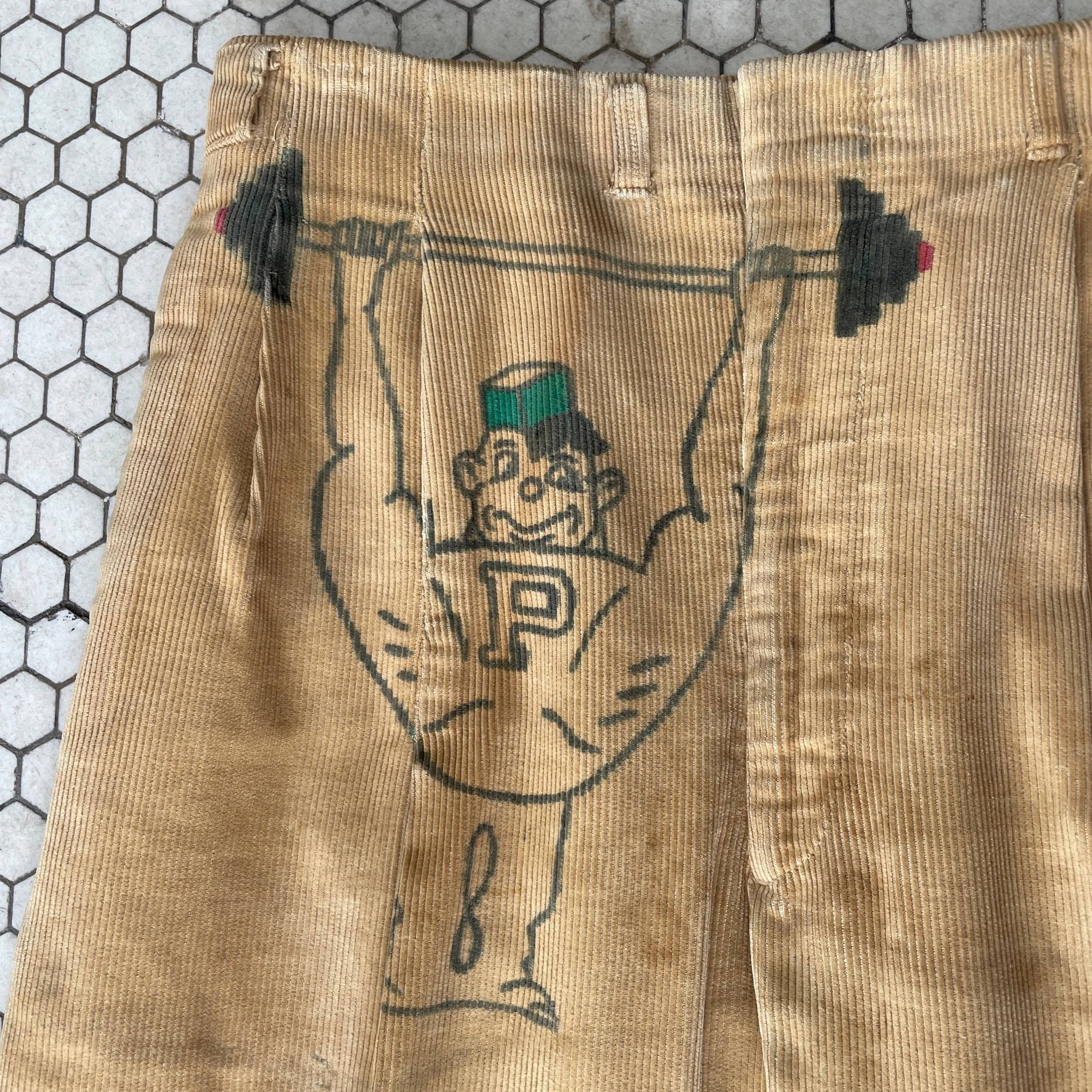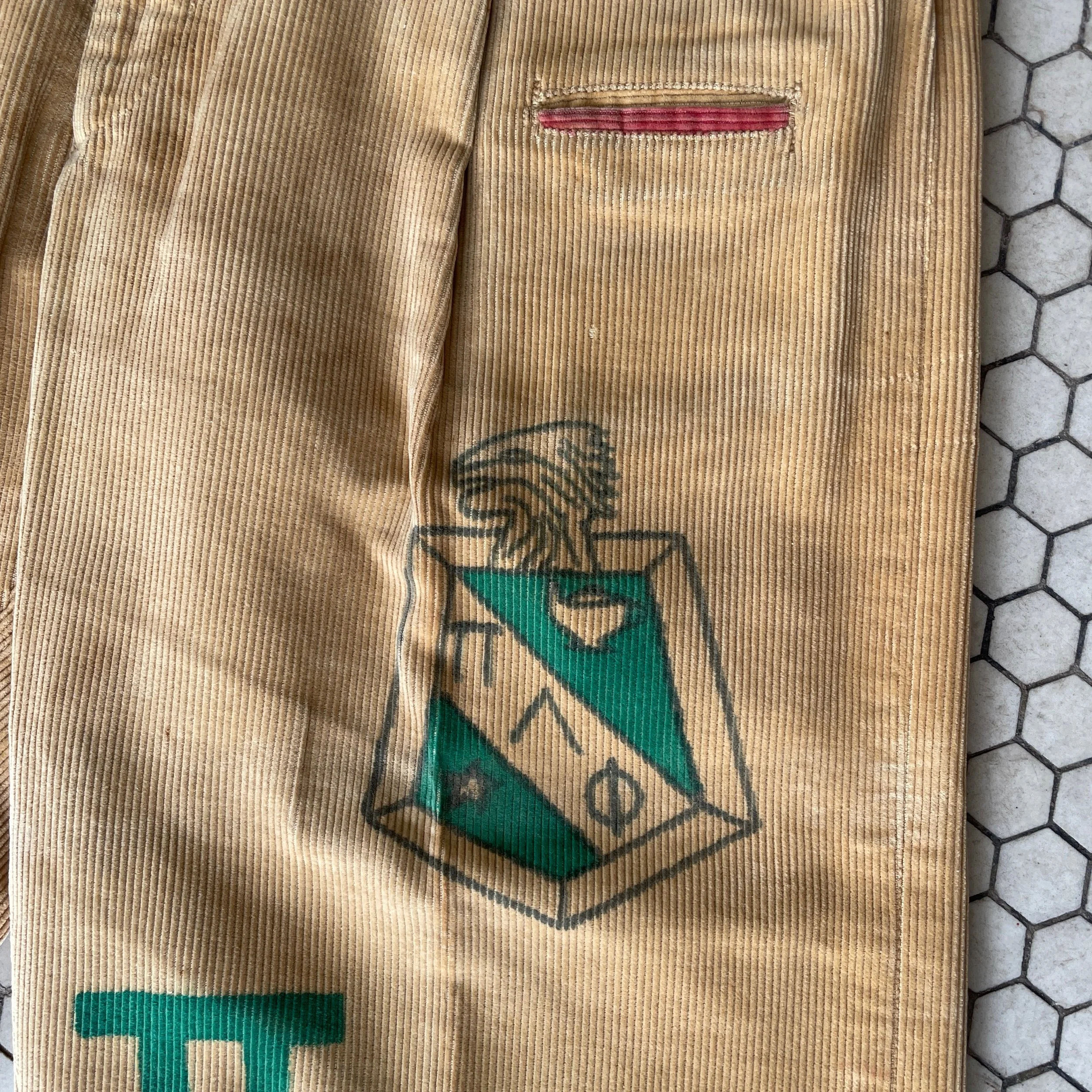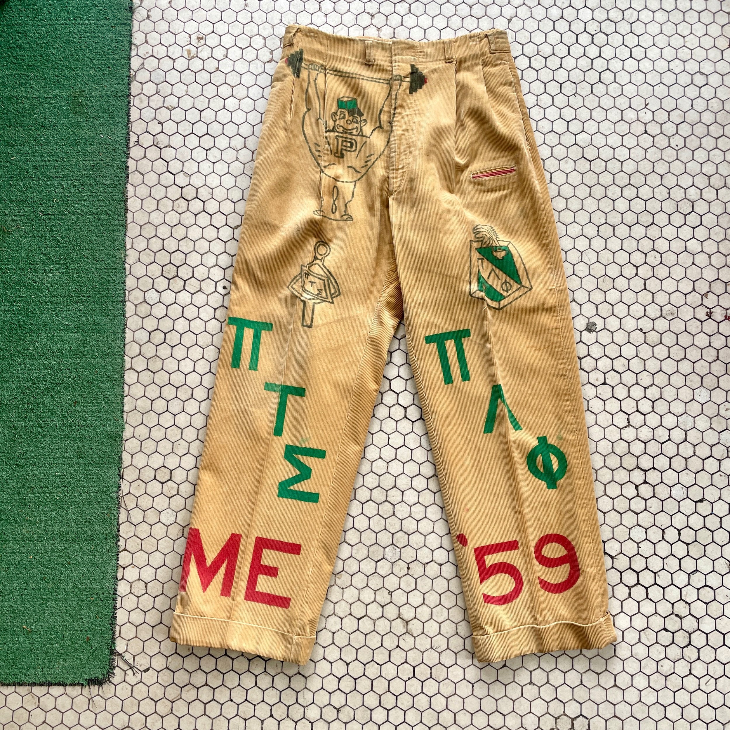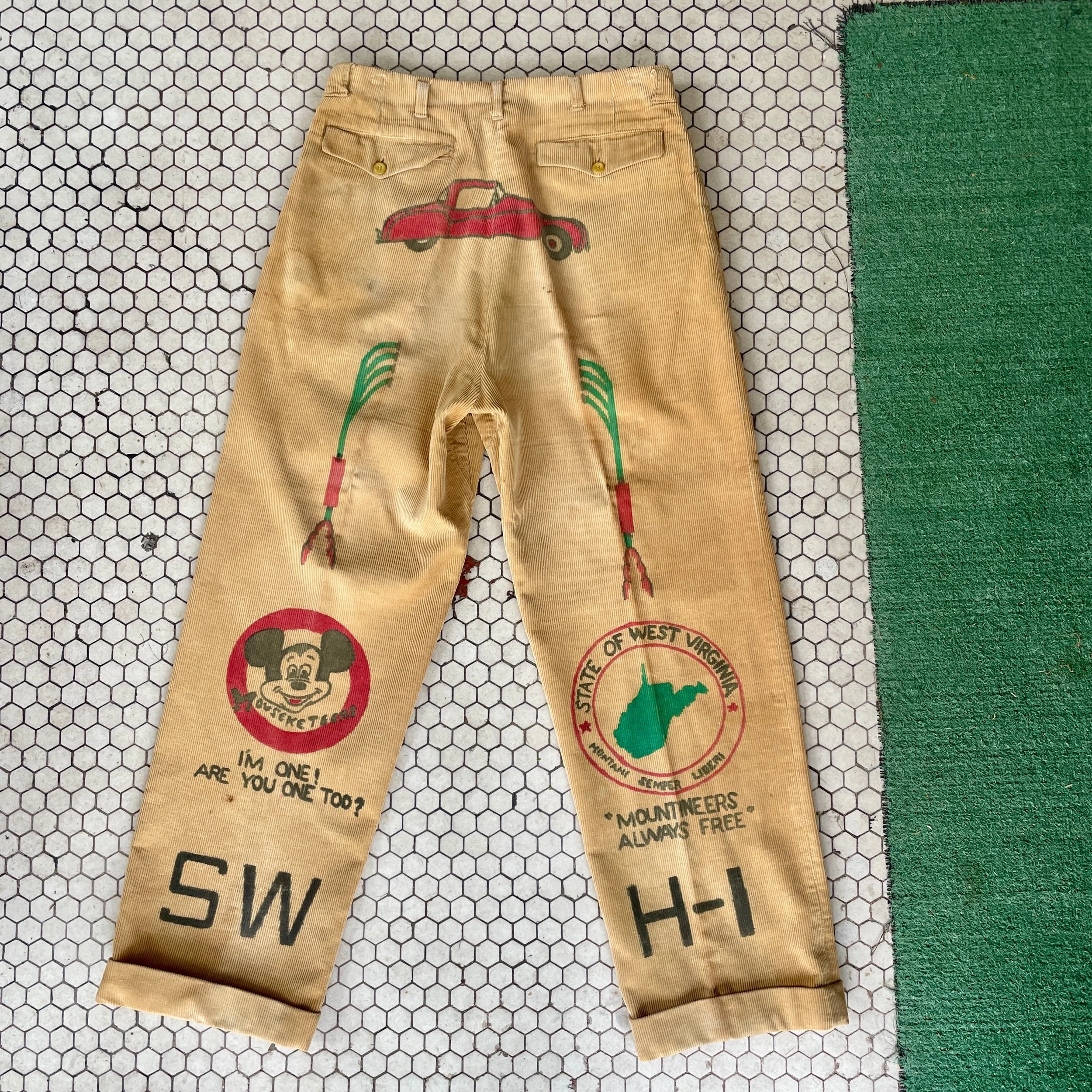Vintage senior cords dated 1959 from Purdue University, hand drawn on a vintage pair of Geisler’s corduroy pants. Loaded with character & sentiment, the drawings and paint feature a delightful, custom collection of personal anecdotes and characters - including a charming little red sports car, a Mickey Mouse “Musketeers” medallion, and, most importantly, the university’s own Purdue Pete with his signature hat and barbell. Given these feature Purdue Pete, it’s more than likely that these senior cords belonged to a Purdue graduate, and Purdue University is where this very trend of senior cords began. Much like walking yearbooks, these pants were a right of passage for seniors , and beginning in 1904 at Purdue university, they gained extreme popularity in the 40’s & 50’s, sparking a trend across high schools and colleges throughout America well into the 1970’s. With over a dozen hand painted designs, these pants clearly have a lot of love put into them, and, again, are actually from a Purdue graduate. These are such a joy to peruse, given all of the clues into the owner’s background, like the WV “mountaineer” medallion and the greek letters. It seems one is for Pi Tau Sigma, an international honor society for mechanical engineering, and another is Pi Lambda Phi, a Yale fraternity. Perhaps this individual was from WV, studied enginerring at Purdue and was destined for Yale. It’s easy to see why these were such a hot trend, and why some people carry on this tradition still today.