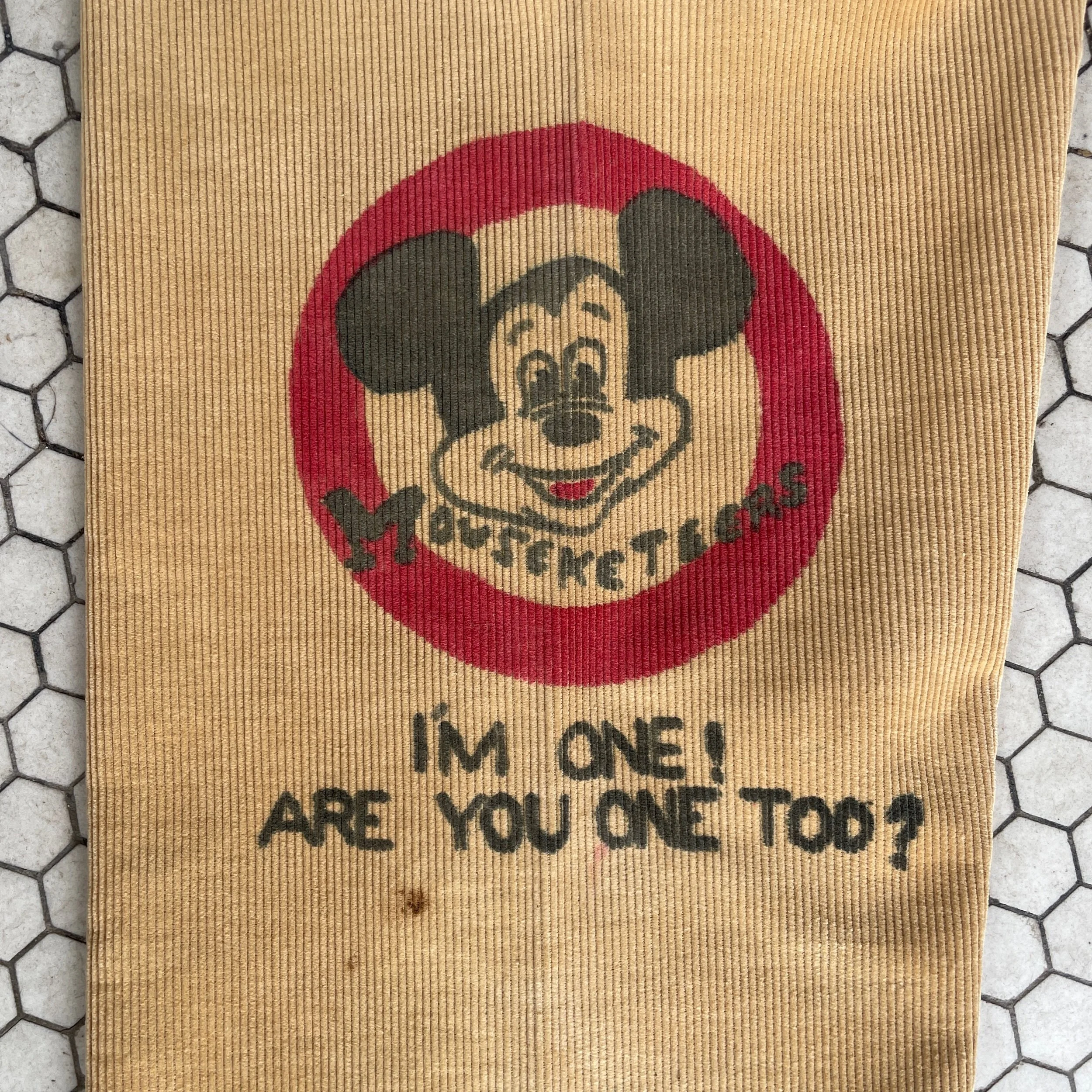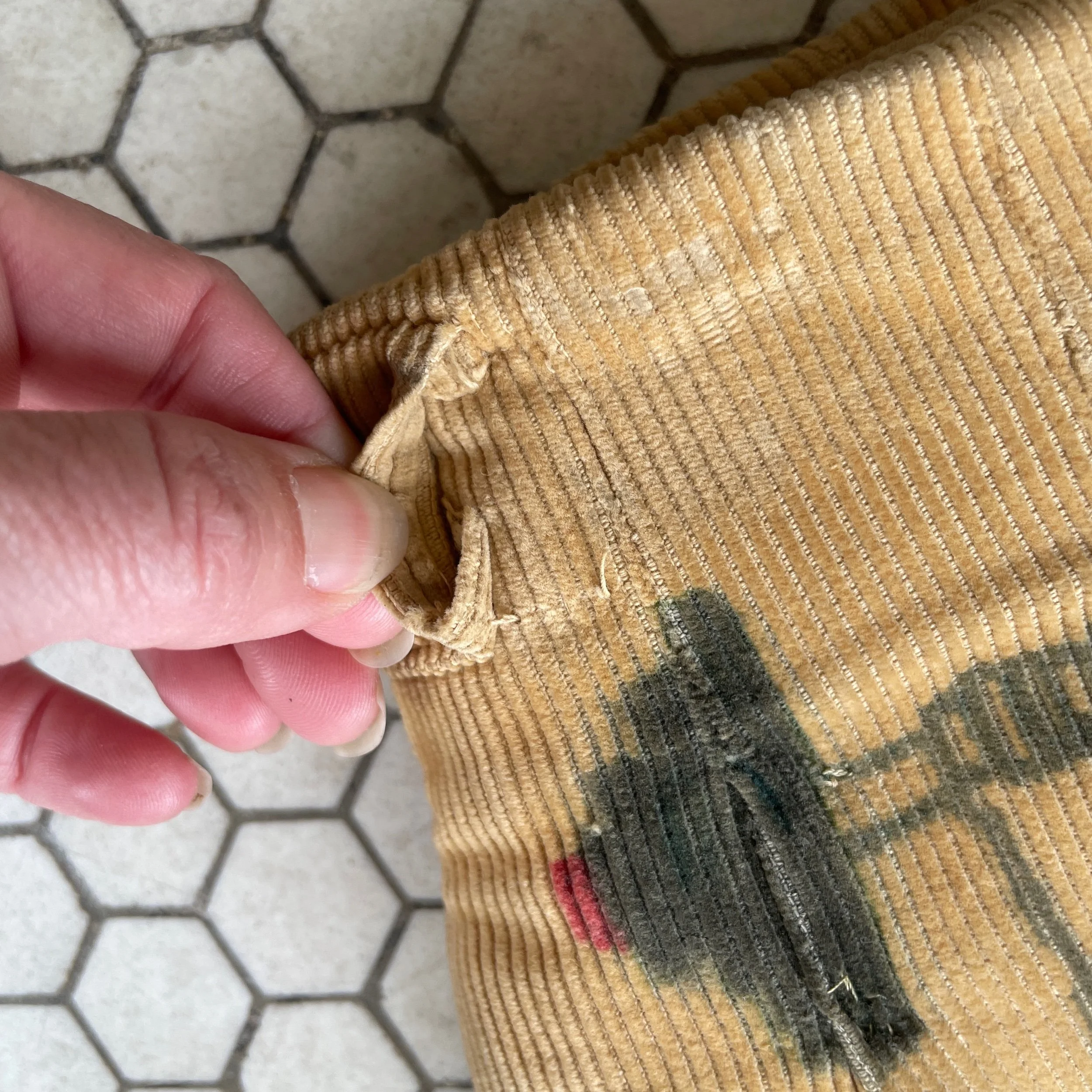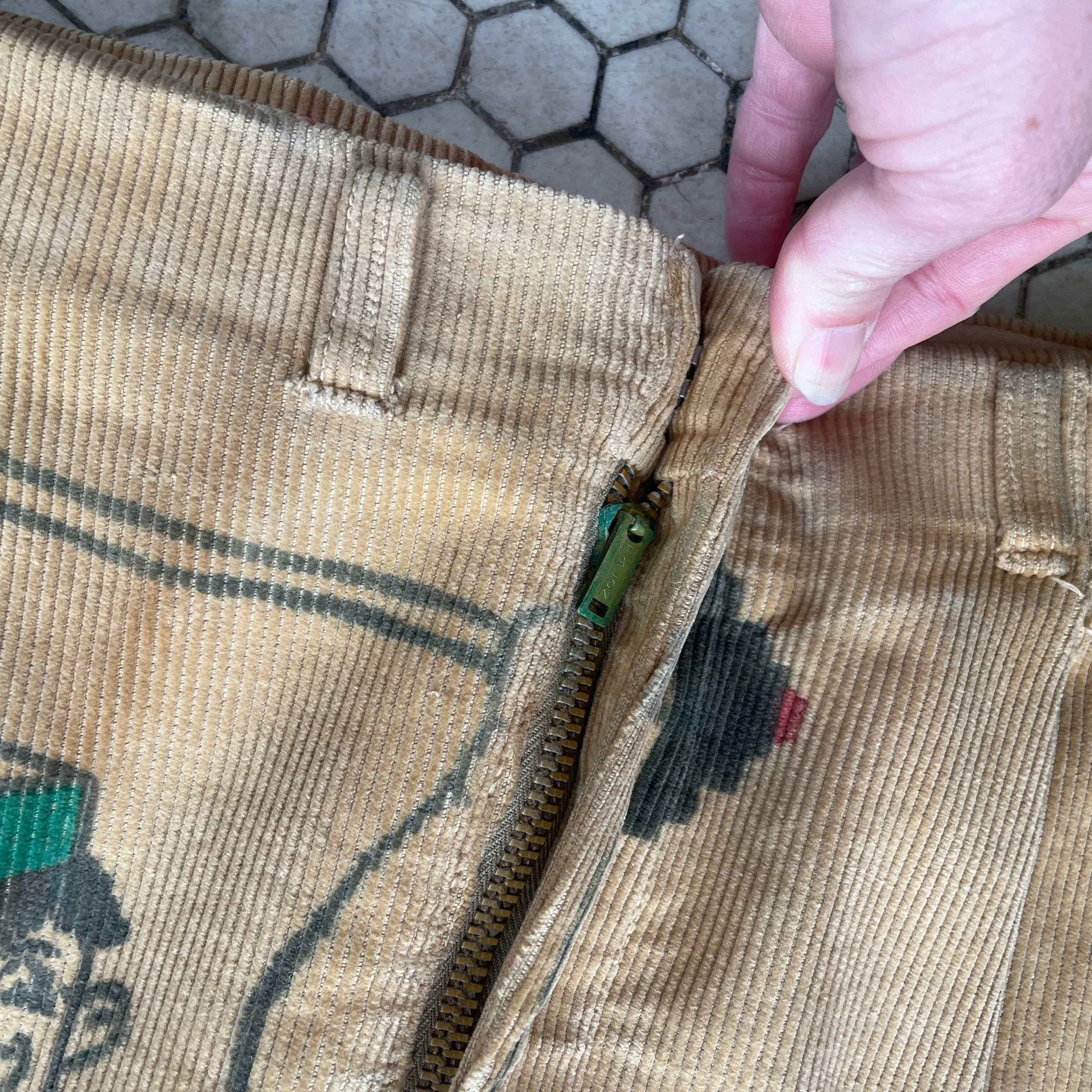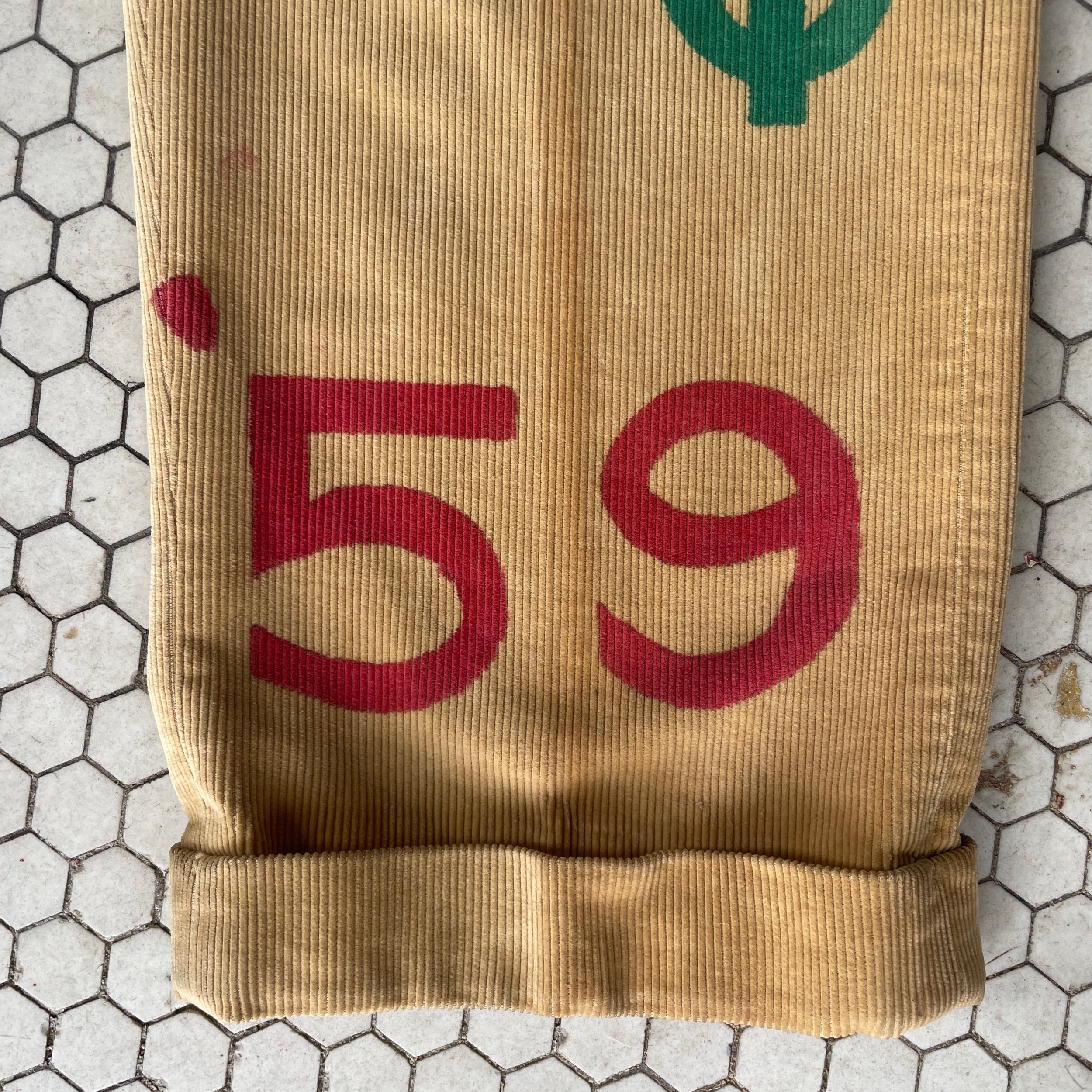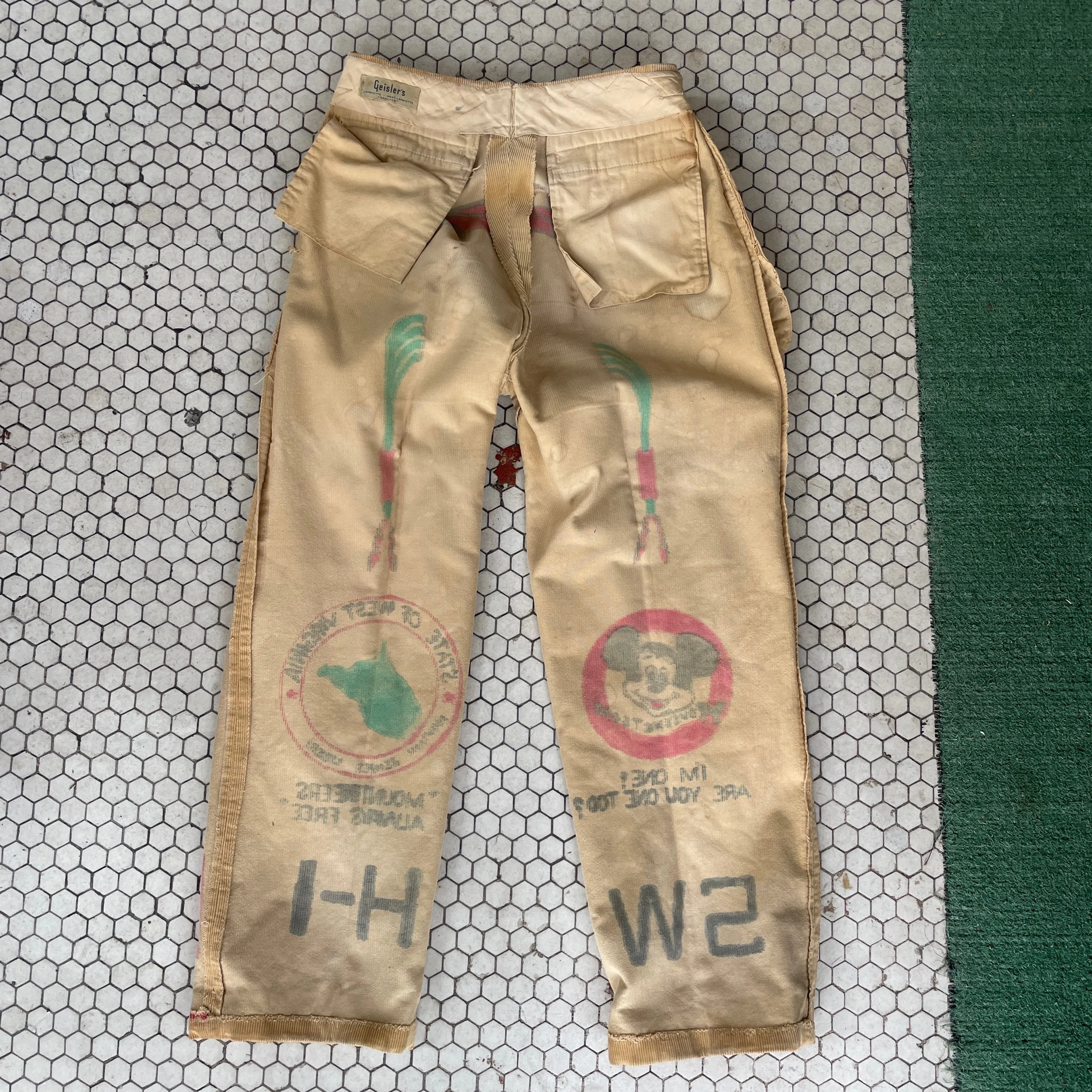 Vintage senior cords dated 1959 from Purdue University, hand drawn on a vintage pair of Geisler’s corduroy pants. Loaded with character & sentiment, the drawings and paint feature a delightful, custom collection of personal anecdotes and characters - including a charming little red sports car, a Mickey Mouse “Musketeers” medallion, and, most importantly, the university’s own Purdue Pete with his signature hat and barbell. Given these feature Purdue Pete, it’s more than likely that these senior cords belonged to a Purdue graduate, and Purdue University is where this very trend of senior cords began. Much like walking yearbooks, these pants were a right of passage for seniors , and beginning in 1904 at Purdue university, they gained extreme popularity in the 40’s & 50’s, sparking a trend across high schools and colleges throughout America well into the 1970’s. With over a dozen hand painted designs, these pants clearly have a lot of love put into them, and, again, are actually from a Purdue graduate. These are such a joy to peruse, given all of the clues into the owner’s background, like the WV “mountaineer” medallion and the greek letters. It seems one is for Pi Tau Sigma, an international honor society for mechanical engineering, and another is Pi Lambda Phi, a Yale fraternity. Perhaps this individual was from WV, studied enginerring at Purdue and was destined for Yale. It’s easy to see why these were such a hot trend, and why some people carry on this tradition still today.