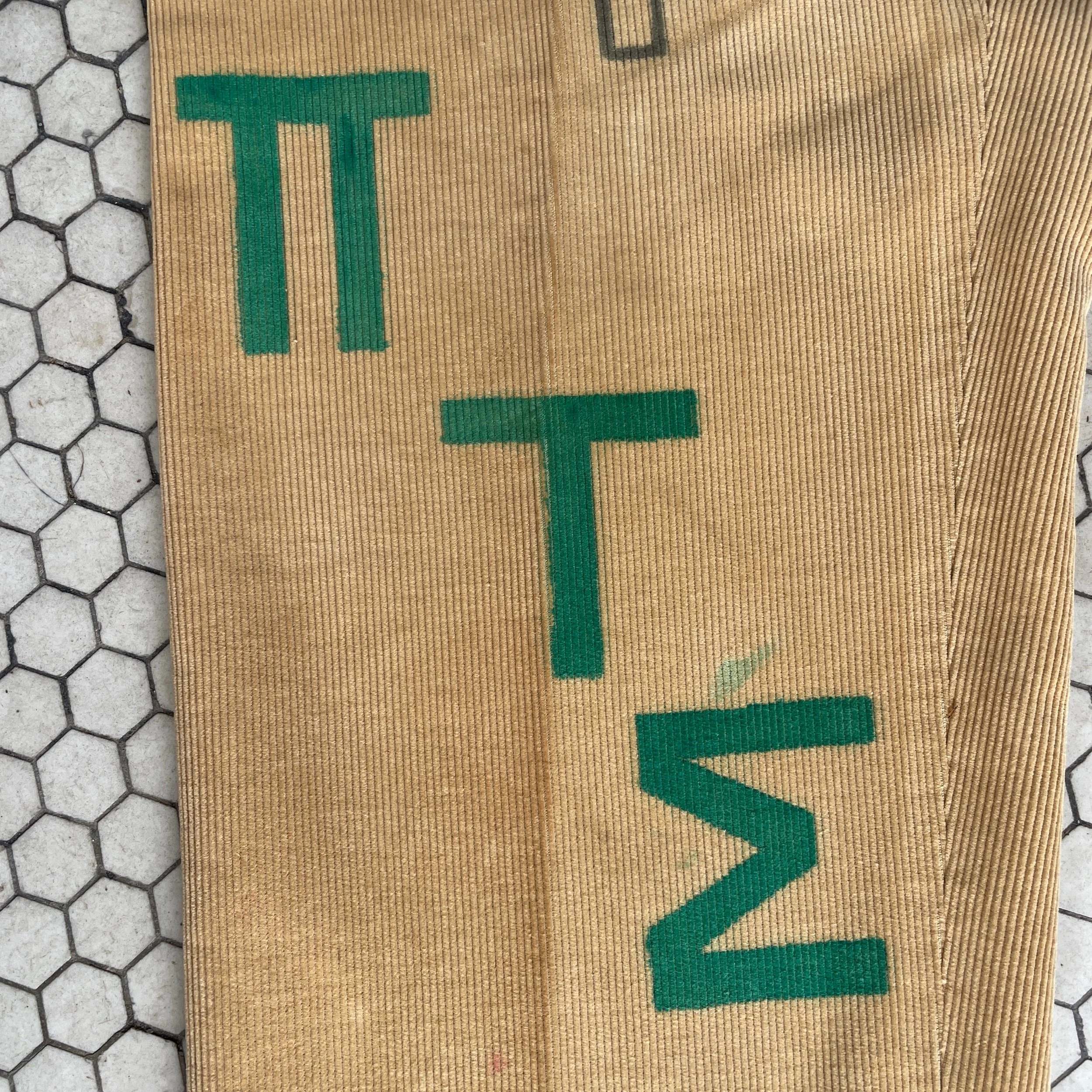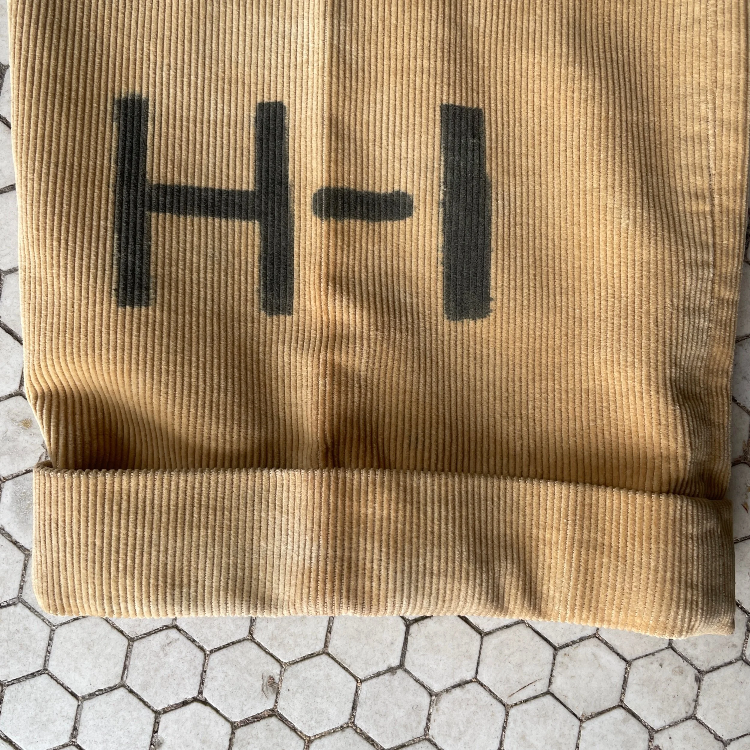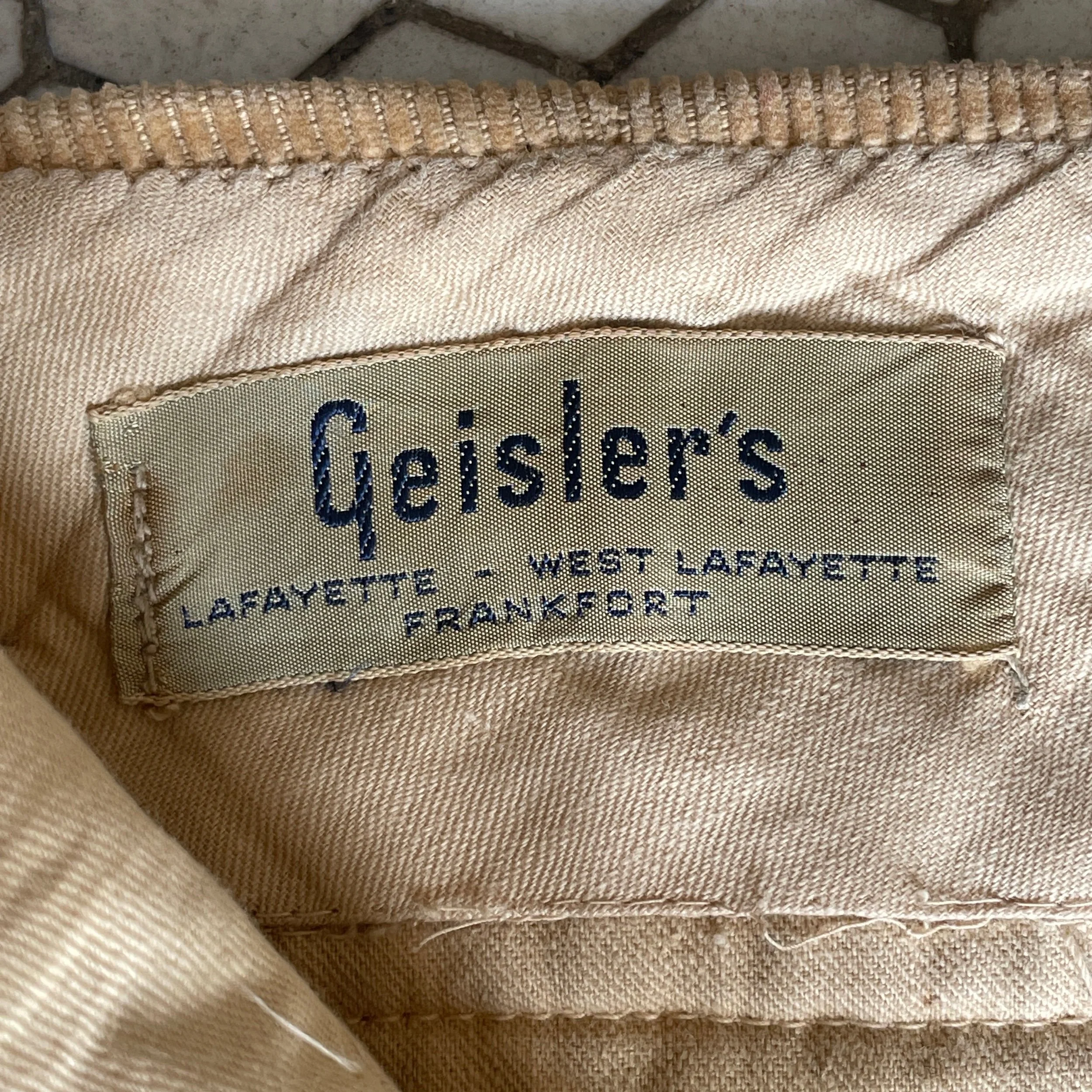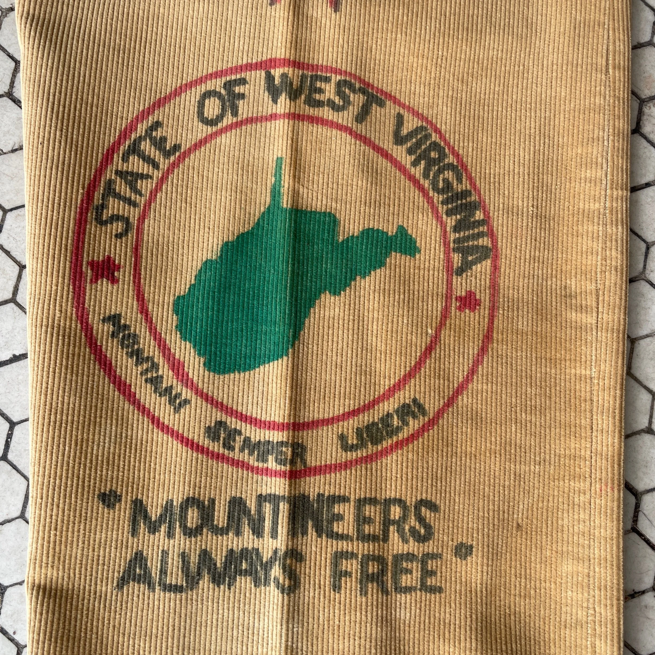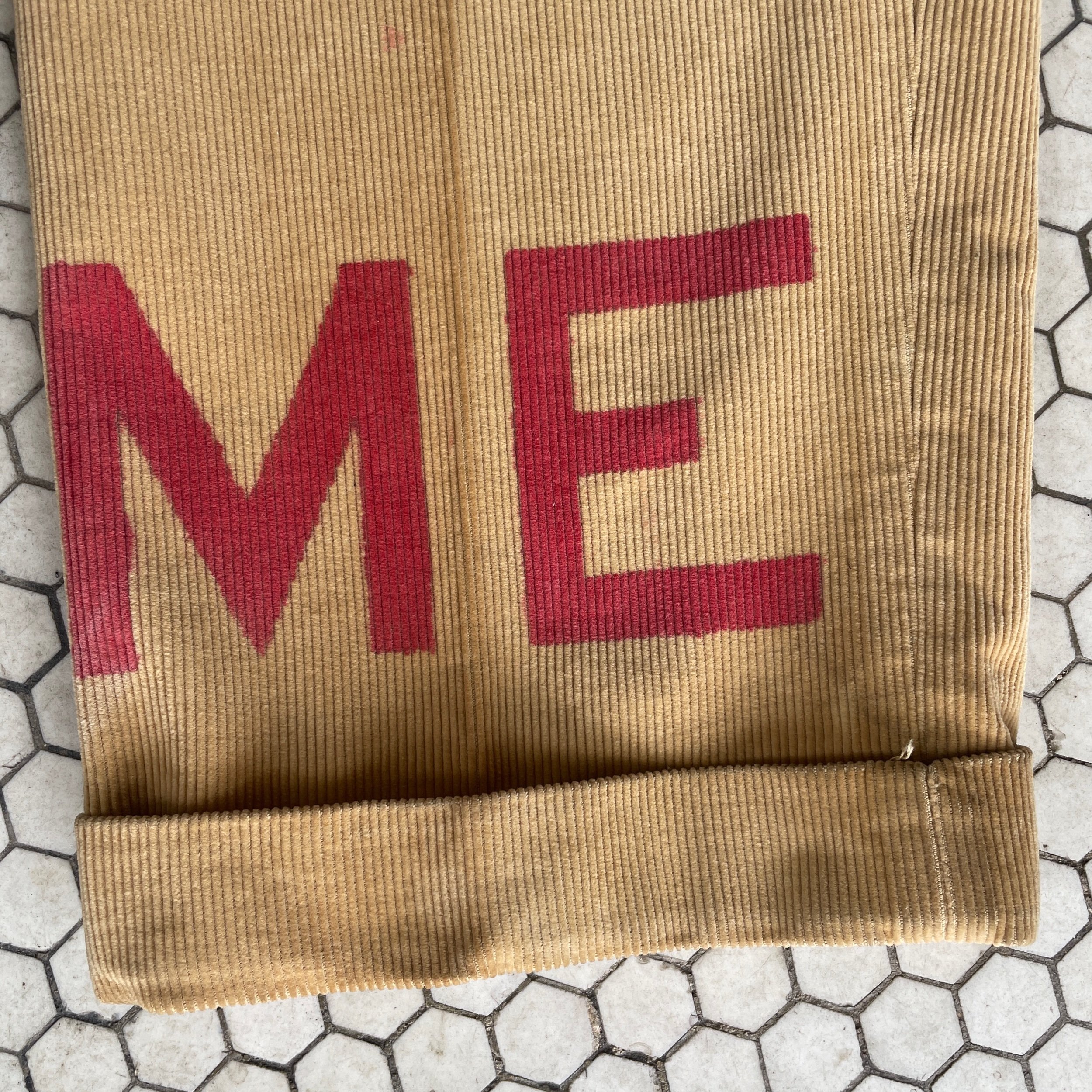 Vintage senior cords dated 1959 from Purdue University, hand drawn on a vintage pair of Geisler’s corduroy pants. Loaded with character & sentiment, the drawings and paint feature a delightful, custom collection of personal anecdotes and characters - including a charming little red sports car, a Mickey Mouse “Musketeers” medallion, and, most importantly, the university’s own Purdue Pete with his signature hat and barbell. Given these feature Purdue Pete, it’s more than likely that these senior cords belonged to a Purdue graduate, and Purdue University is where this very trend of senior cords began. Much like walking yearbooks, these pants were a right of passage for seniors , and beginning in 1904 at Purdue university, they gained extreme popularity in the 40’s & 50’s, sparking a trend across high schools and colleges throughout America well into the 1970’s. With over a dozen hand painted designs, these pants clearly have a lot of love put into them, and, again, are actually from a Purdue graduate. These are such a joy to peruse, given all of the clues into the owner’s background, like the WV “mountaineer” medallion and the greek letters. It seems one is for Pi Tau Sigma, an international honor society for mechanical engineering, and another is Pi Lambda Phi, a Yale fraternity. Perhaps this individual was from WV, studied enginerring at Purdue and was destined for Yale. It’s easy to see why these were such a hot trend, and why some people carry on this tradition still today.