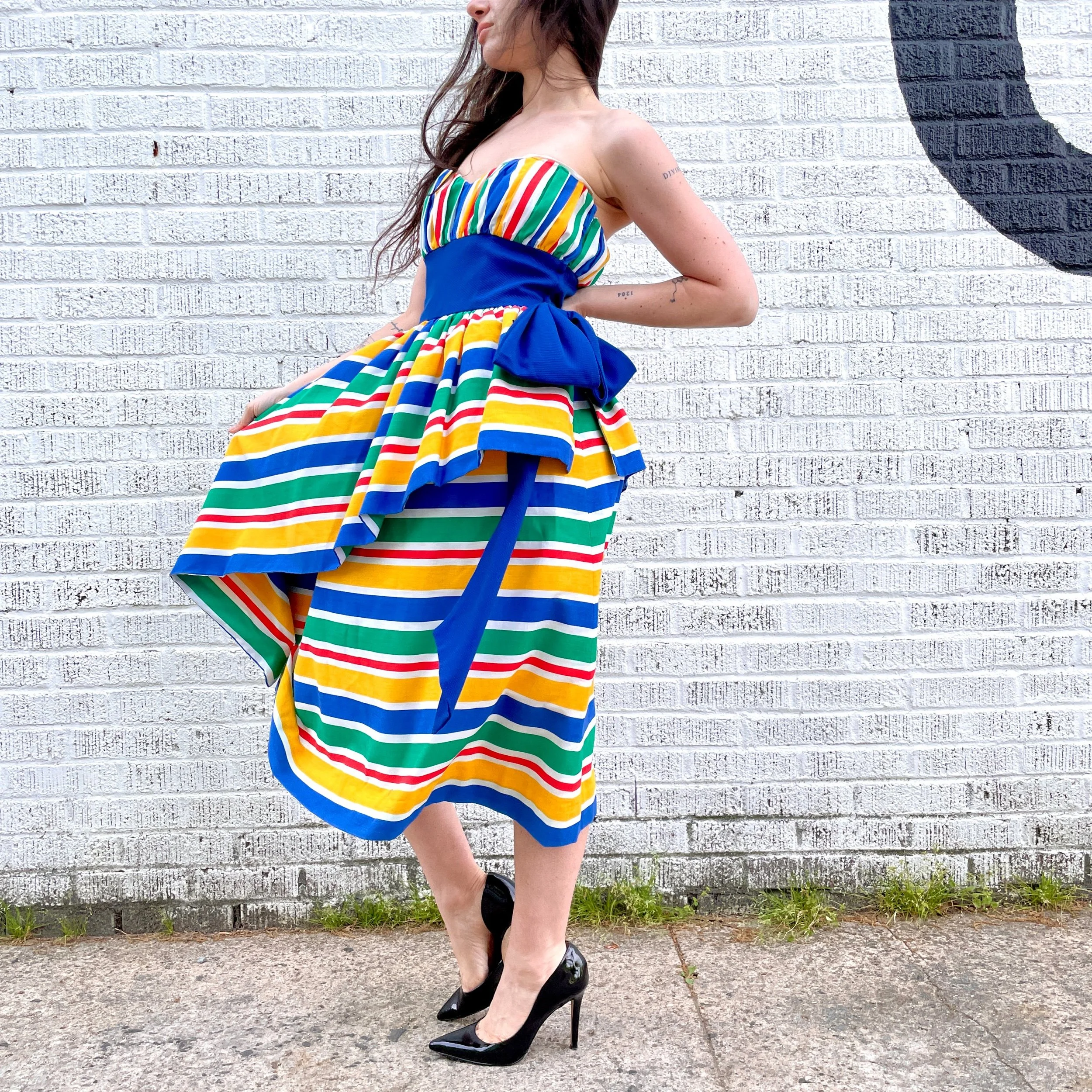This delightfully bright party dress is just the thing for your next soirée! This is a Victor Costa design from Fine Feathers, a small but beloved high-end boutique at the height of its popularity in the 1980s. The Costa label is not present but a quick image search will show you that this is, in fact, a Victor Costa - which Fine Feathers bought and sold regularly. The bold, primary colored stripes are impossible to ignore with their eye-catching design and bright multi-colored patterns. Made of 100% cotton and fully lined with a built in crinoline, it’s both comfortable enough for a garden party and formal enough for a summer wedding. Accented by a bright cobalt knit fabric waistband and bow sash- which snaps on to the skirt to cover the waist fastenings. This dress is so perfectly 80’s, from the asymmetrical peplum to the boned strapless bodice, it’s everything you want in an 80’s party dress. Freshly dry cleaned and ready to dance again!